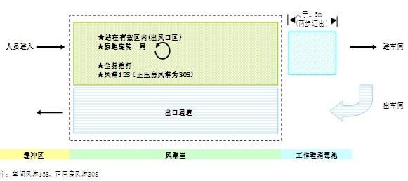 (2)進入風淋室,站在有效區內,原地旋轉身體一周并拍打衣服。